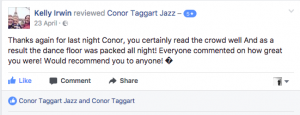 “Conor Taggart is not just a singer, he is one of a very unique breed. Conor is an Entertainer. Put him in a room, small or large and immediately he creates a buzz. His warm, affable nature blended with his impressive set list makes for a great evening. Tribute singers are a plenty but Conor stands out from the pack as he is a people person. Suffice to say, book Conor once, it won’t be too long before you have him back again and again.”