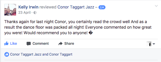 “Conor Taggart caught our ear one night with his wonderfully smooth and soulful singing voice while out to dinner with friends. We instantly knew what an addition he would be to our upcoming wedding and hired him then and there. His performance during our wedding meal made the night! I could not recommend him more highly as a punctual, polished and professional entertainer and a no brainer addition if you want the wow factor at your wedding.”